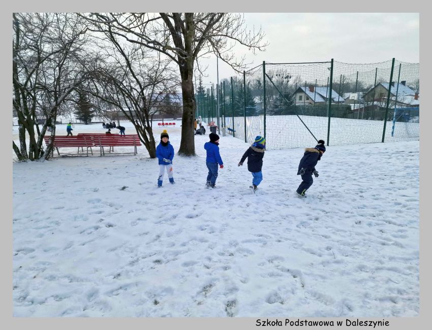 Zimowa aura od dłuższego czasu sprzyja radosnym aktywnościom na świeżym powietrzu. Szkolne podwórko stało się miejscem pełnym śmiechu, zabawy i dziecięcej radości. Dzieci chętnie korzystały z uroków zimy, bawiąc się na śniegu oraz lepiąc bałwany.